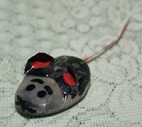 这是我用一粒黑灰色的石头制成的。它的耳朵和尾巴使用纸张涂上颜色,然后再个各别粘上去。